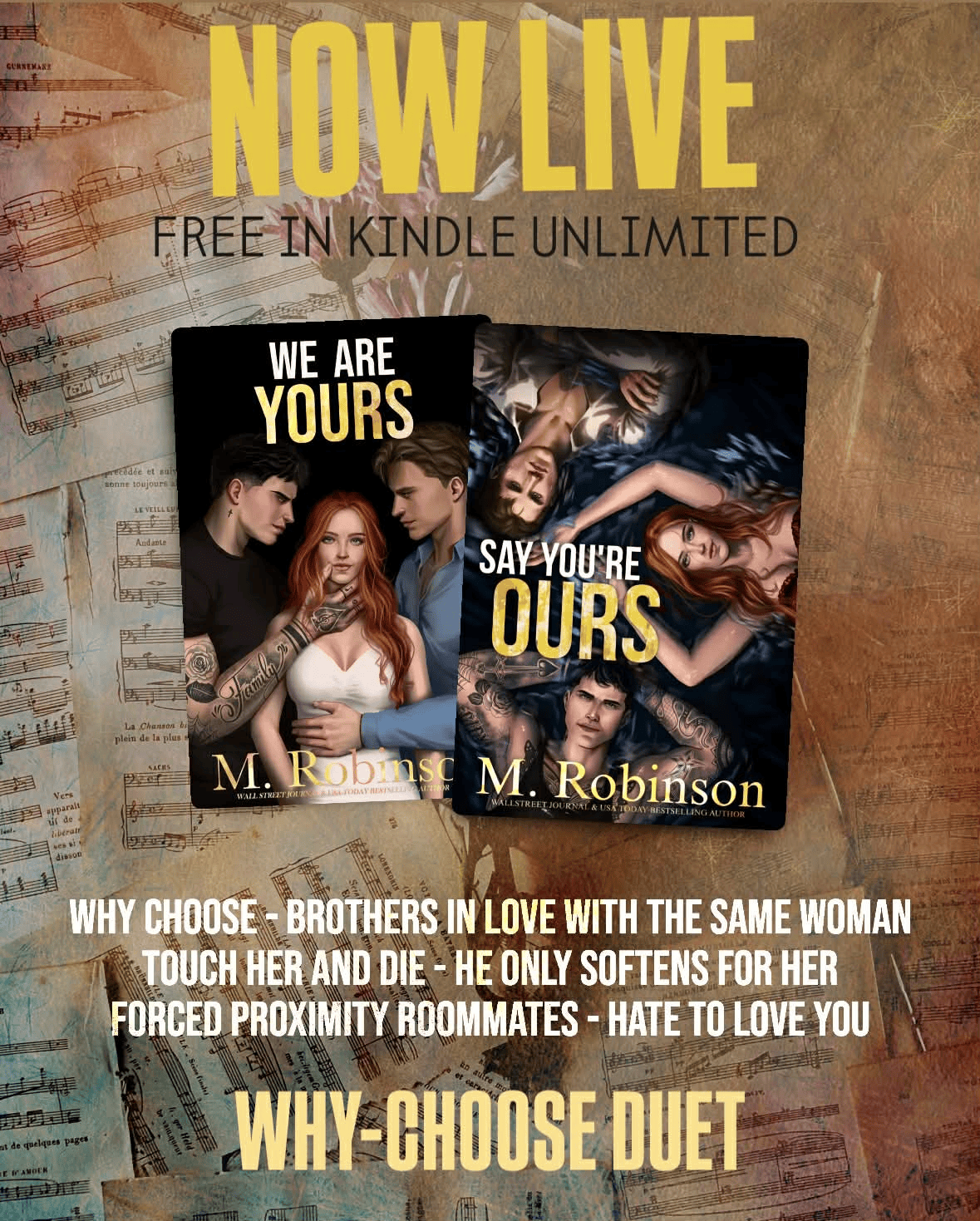From Wall Street Journal and USA Today Bestselling Author M. Robinson comes an angsty, forced proximity love triangle where secrets test brotherly bonds and music brings them together, only to have destiny threaten to tear them apart.